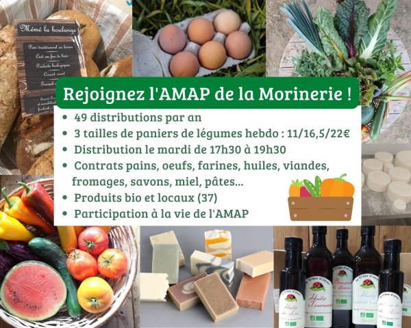- Adhésion annuelle avec 48 paniers de légumes hebdo- Retrait des paniers tous les mardis entre 17h30 et 19H30 à la Morinerie